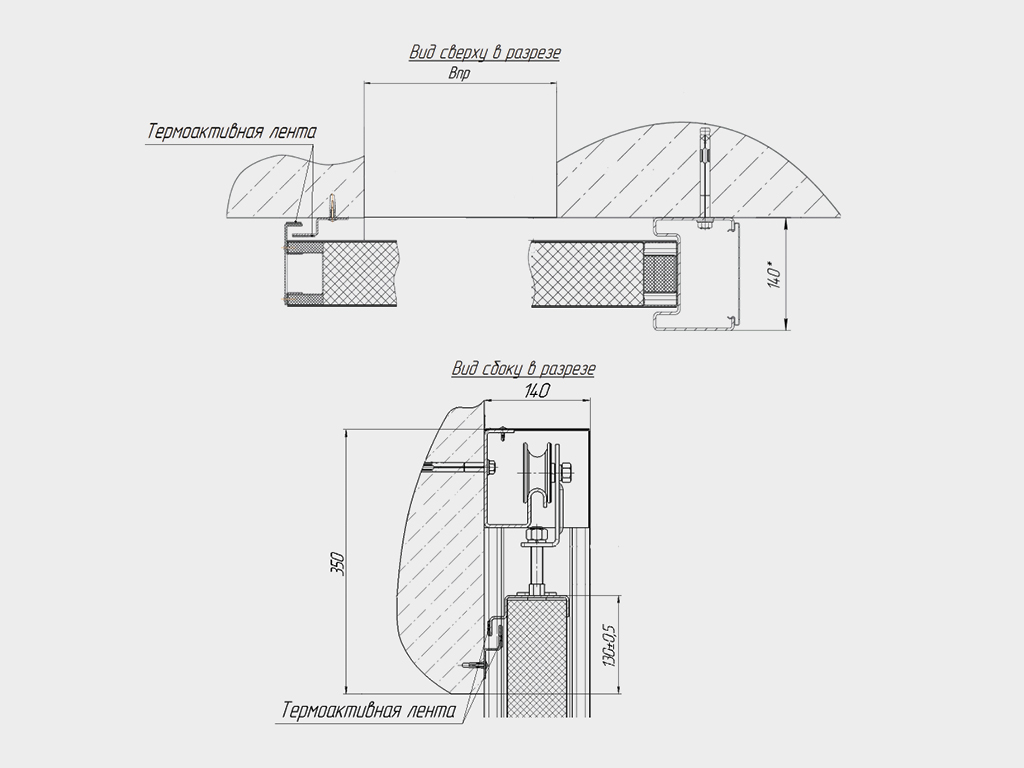 Накладной монтаж. Система направляющих устанавливается на пристенки и притолоку с внутренней стороны проема относительно помещения.