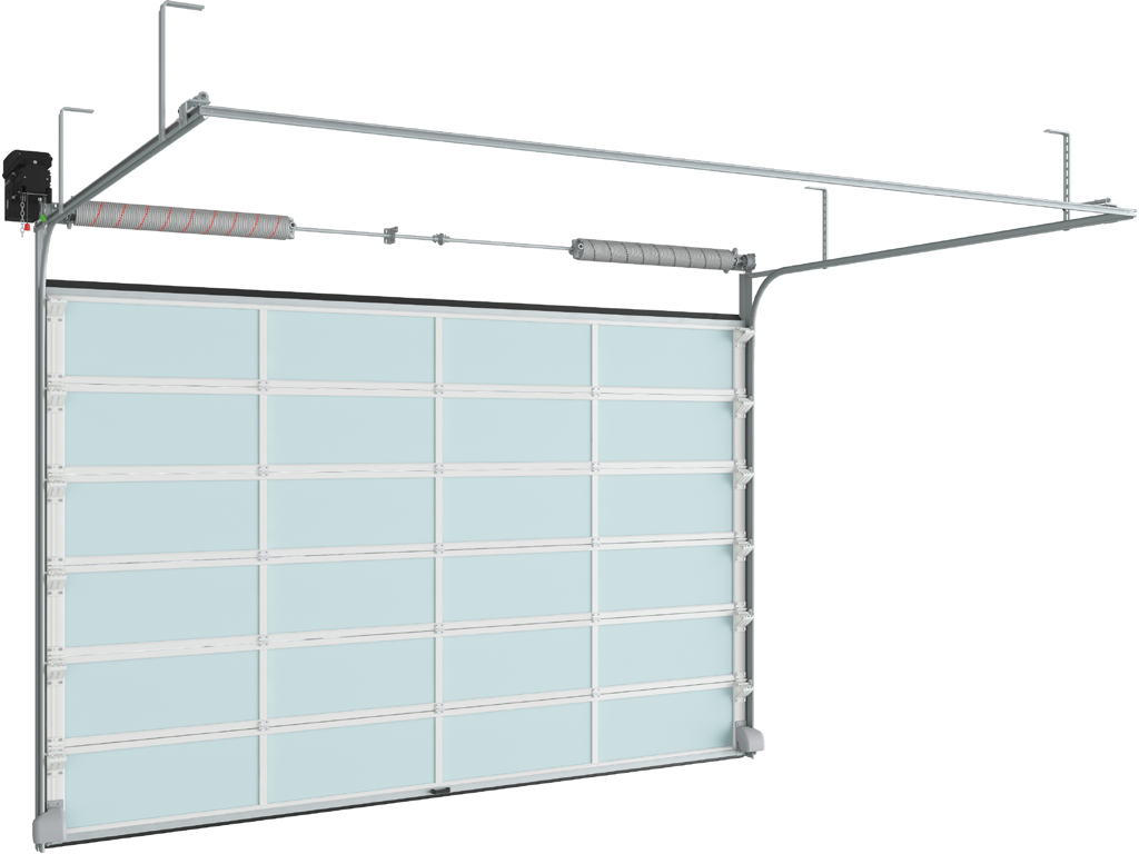 Секционные ворота серии ISD02 полностью или частично состоят из панорамных панелей, благодаря чему являются идеальным вариантом для установки в зданиях с остекленными фасадами.